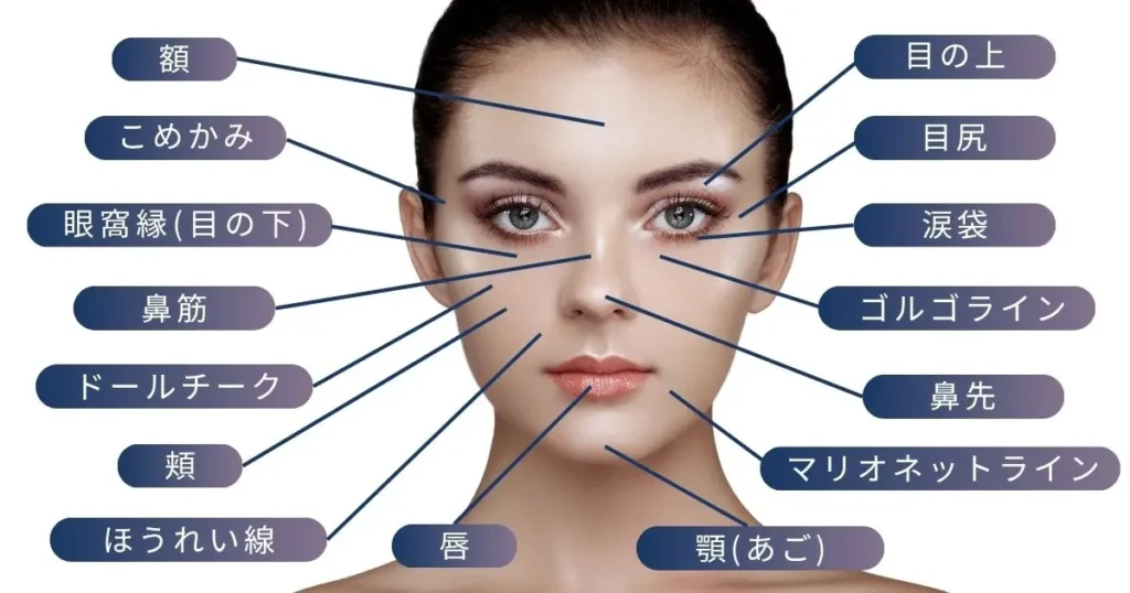 ヒアルロン酸注入が行われる部位には、ほうれい線、マリオネットライン、ゴルゴライン、目の下のくぼみ、額、こめかみ、唇、あご、鼻、フェイスラインなどがあります。シワの改善だけでなく、輪郭を整えたり、立体感を出したりする目的でも使用されるため、患者様の希望や顔全体のバランスを考慮して注入部位が決定されます。
