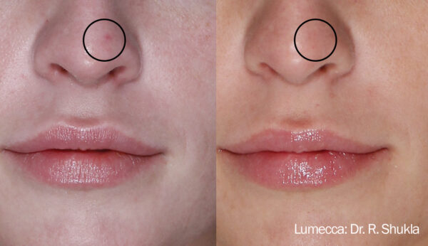 ルメッカは、シミやそばかすの原因であるメラニン色素に非常によく吸収される波長の光を強力に照射します。この光エネルギーがメラニンに反応すると、シミは一時的に濃く浮き上がったようになり、マイクロクラストと呼ばれる細かいかさぶたを形成します。