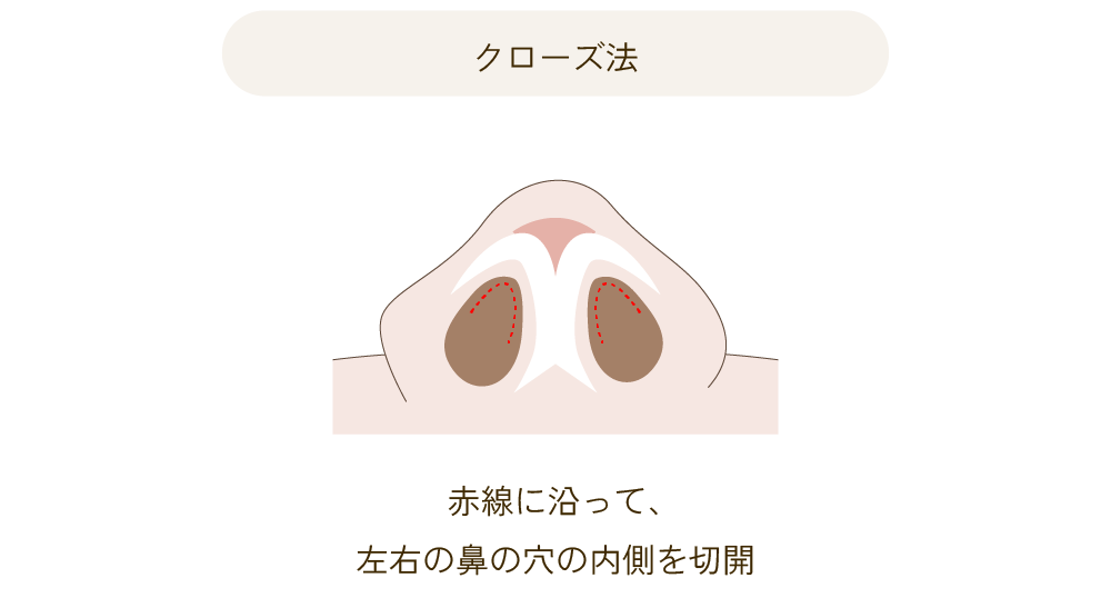 クローズ法の鼻尖形成は、鼻の穴の内側からアプローチし、鼻先の軟骨や余分な脂肪を調整することで、鼻先を細く、形を整える施術です。