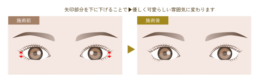 目尻側の下まぶたが下がることで、目の縦幅が広がり、大きく見える効果が期待できます。また、まぶたの引き下げる位置によっても仕上がりの印象は大きく変わります。たとえば、目尻中心であればタレ目が強調され、黒目中心であれば丸くぱっちりとした目元に変化させることが可能です。