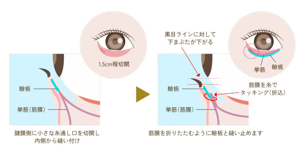 まず、下まつげのラインに沿って皮膚を切開し、余分な皮膚や脂肪を必要に応じて調整します。その後、結膜側から靭帯や筋肉を引き下げることで、目尻側の下まぶた全体を下方向へ固定し、タレ目ラインを形成します。