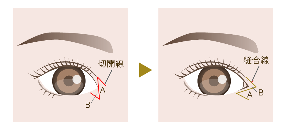 Z法では、目頭にZの形になるようにメスを入れ、皮膚を入れ替えてから縫合します。あくまでも切開のみで、皮膚の切除は行わない点がZ法の大きな特徴です。