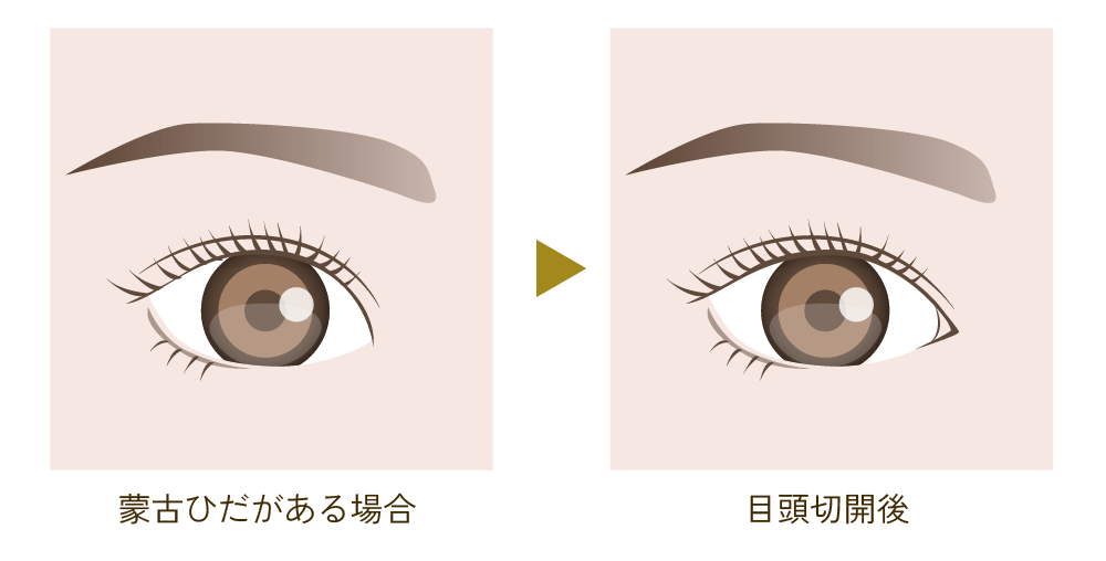 目頭切開は、目頭部分に被さっている“蒙古襞(もうこひだ)”という皮膚を切開し、目の横幅を鼻の方向に向かって広げて、大きく見せる施術です。蒙古襞は、東洋人によく見られる特徴のひとつで、日本人も約80%の人が該当すると言われています。蒙古襞が被さることで目が小さく見えるほか、目と目の距離が強調されてしまいます。